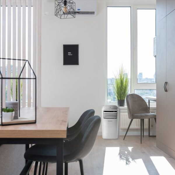 Aire acondicionado portátil MOBIS, perfectpara habitaciones entre los 11m2 y 20m2 (según modelo). Es una solución perfecta para ntener que hacer una gran inversión para instalar un aire acondicionadtradicional en casa. Además, los puedes ir moviendde habitación a habitación.