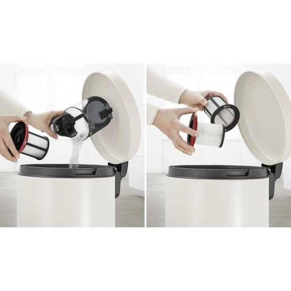 El filtro higiénico es lavable y extraíble, facilitando un mantenimiento sencillo y económico. El depósito de 0,3 L se vacía fácilmente sin contacto directo con la suciedad.