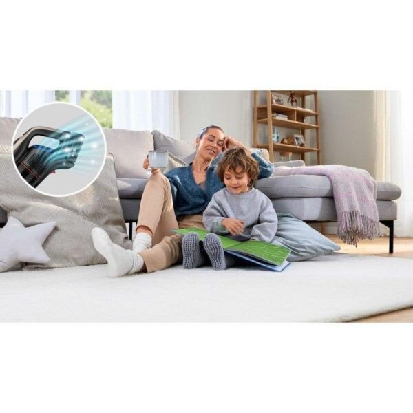 El filtro HEPA lavable y la tecnología MicroClean eliminan el 99,99 % de partículas, ácaros y alérgenos, convirtiendo esta aspiradora en la opción ideal para personas alérgicas o con mascotas. El cepillo motorizado MicroClean con LED y sensor inteligente detecta partículas invisibles y avisa cuando la limpieza es óptima, mientras que el sistema anti-enredos reduce el mantenimiento y evita obstrucciones por pelo.