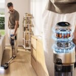 Incluye un kit Home&Car con 8 accesorios específicos para mascotas, tapicerías, rincones y muebles, además de tubo flexible y soporte de pared con carga. La pantalla LED muestra el nivel de batería y alertas de mantenimiento en tiempo real. El filtro HEPA retiene el 99,9 % de micropartículas y alérgenos, expulsando aire más limpio, ideal para personas sensibles o con alergias.