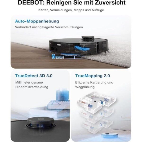 Détection des tapis : Lorsque le Deebot T30 OMNI passe sur un tapis, ses serpillières se soulèvent automatiquement pour éviter de les mouiller, tout en augmentant la puissance d’aspiration pour un nettoyage en profondeur.