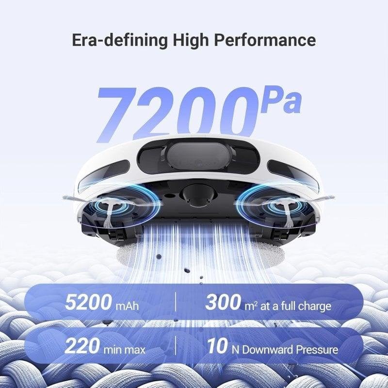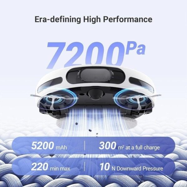 Autonomie : jusqu’à 220 minutes par charge (batterie Li-ion 5.200 mAh), gestion des grandes surfaces (jusqu’à 300 m²) avec retour et reprise automatique du nettoyage.