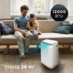 Ambiente saludable gracias al modo deshumidificación capaz de captar hasta 26 litros por día, y filtro de aire que retiene partículas grandes, mejorando la calidad del aire. Incluye ruedas multidireccionales y asas para máxima portabilidad, temporizador programable (24 h) y sistemas de seguridad avanzados (antiheladas, antidesbordamiento, protección del compresor).