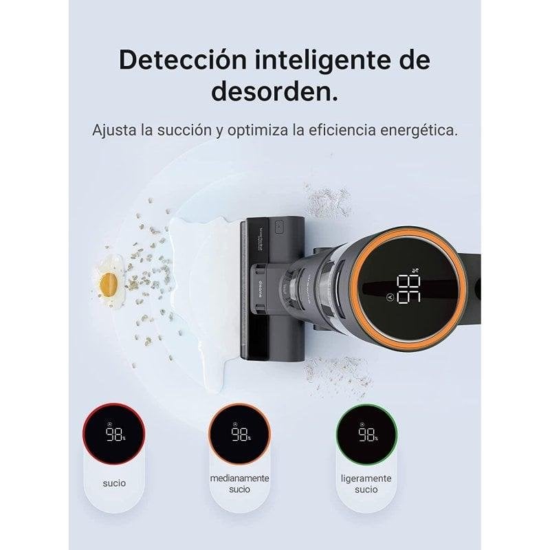 La detección inteligente por infrarrojos ajusta automáticamente la potencia y el caudal de agua según el nivel de suciedad, optimizando el consumo y la eficacia. La pantalla LED y la interfaz de voz facilitan el control y el seguimiento del estado de la aspiradora en todo momento.