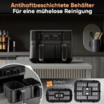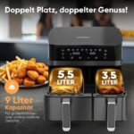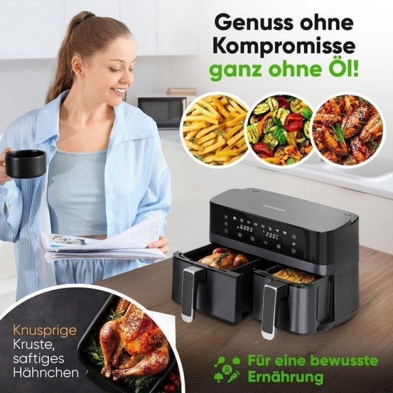 Versatilidad profesional y control total. La Freidora de Aire ProfiCook PC FR 1295 H está diseñada para usuarios exigentes que buscan resultados óptimos en cocina saludable. Sus 2700 W de potencia y doble cesta independiente (1 x 5,5 L + 1 x 3,5 L) permiten preparar diferentes recetas simultáneamente, gestionando temperatura y tiempo por separado en cada compartimento. Así, puedes cocinar carnes y vegetales a la vez, sin transferencia de sabores ni aromas.