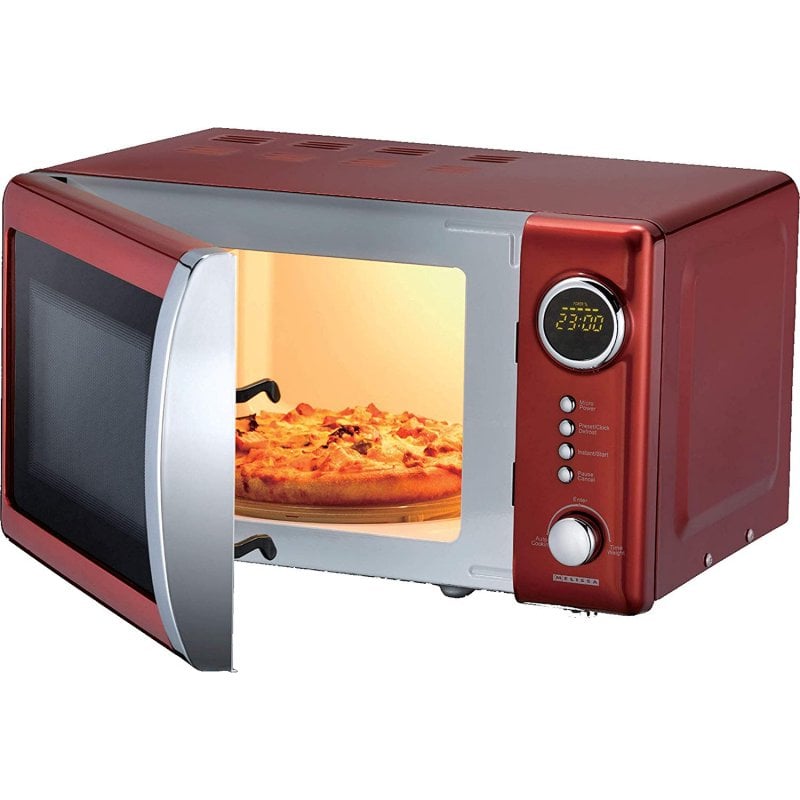 Microondas Digital Melissa estilo Retro/Vintage de 700W -bajo consumo- de 20 litros de capacidad y con 5 niveles de potencia. Incluye pantalla LED configurable con indicador de hora, tiempos de cocción y temporizador ajustable de 60 minutos (puede programarse el encendido del microondas).
